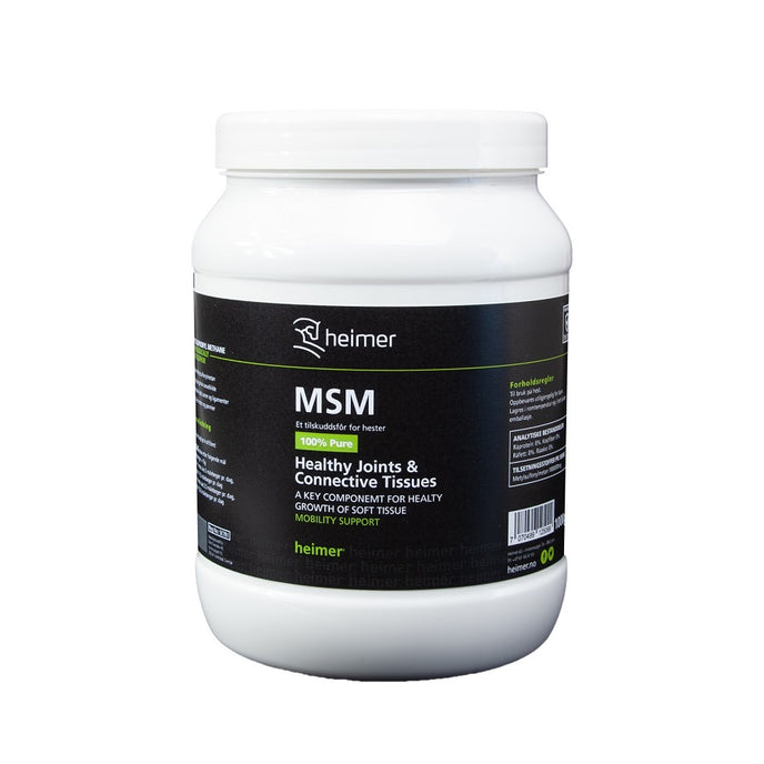 - Heimer MSM er en naturlig og organisk svovelkilde som virker som byggesteiner i kroppens celler.MSM vedlikeholder ledd, sener og ligamenter, samt forkorter restitusjonstiden. Det har også vist seg at MSM har en positiv effekt på hester med sommereksem.