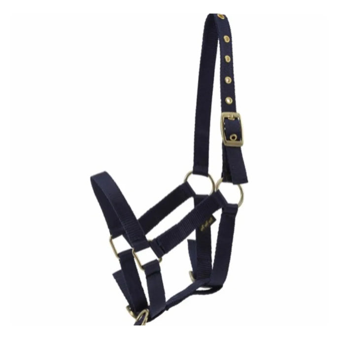 Justerbar føllgrime fra HorseGuard i navy blå med messingfargede spenner. Størrelse yearling