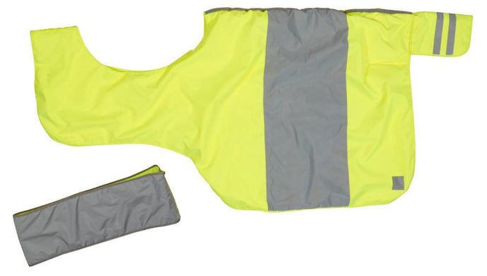 Reflekterende ridedækken med haleklap og reflekterende bånd omkring halsen. Horse Guard b'seen logo. Lys neongul farve for ekstra synlighed.