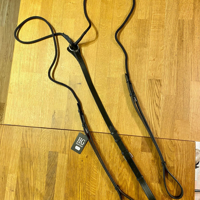 - Festes rundt gjorden midt under med løkke, føres gjennom bittringene og festes rundt gjordstroppene like under sjabraken, eventuelt i ringene på longeringsgjorden.