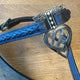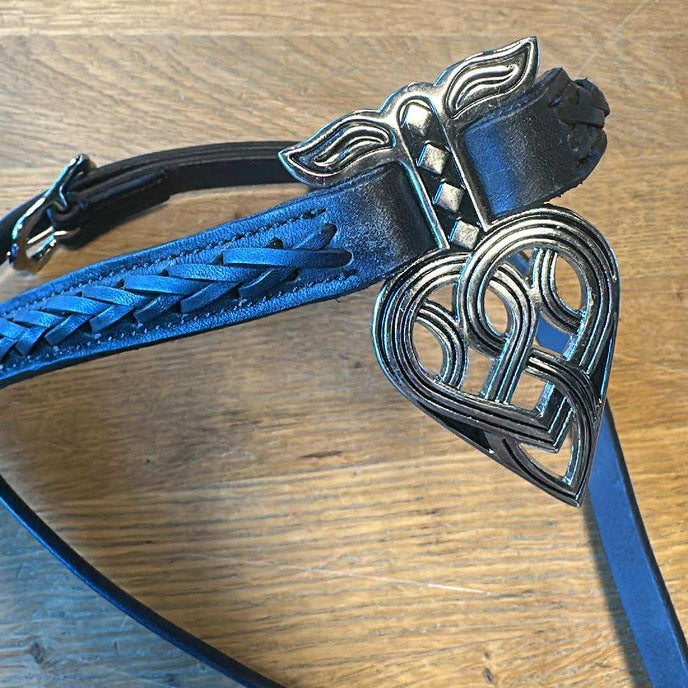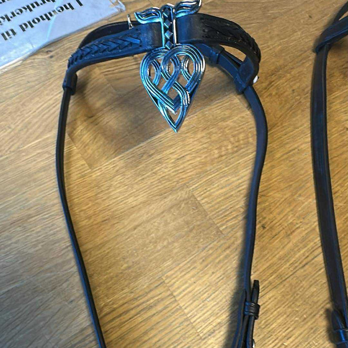 - Pannereim er dekorert med flettet lær, V-formet, og har stort ornament fra viking tid.