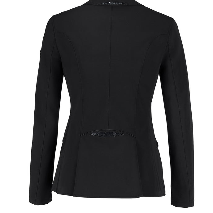 - Klapplommer med subtil, matchende Rhinestone-påføring og delikat satengrør som gjentas på krageinnsatsen og i midjen på baksiden.