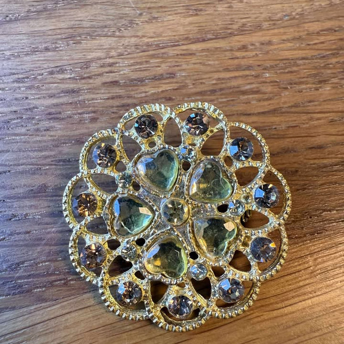 lekker pin med nål for å feste i stevnejakke, genser, shorte og lignende. gullfarget med grønne hjerter formet som en blomst