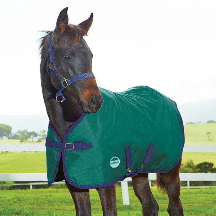 WeatherBeeta 1200D Foal Standard utedekken er et vanntett og pustende følltekken med et sterkt 1200 denier ripstop-ytterstykke og Guard-Tec-belegg. Dette mellomvektige utedekkenet har 220 g polyfyll for varme og har en justerbar spenne foran, lave kryssgjorder og halesnor.
